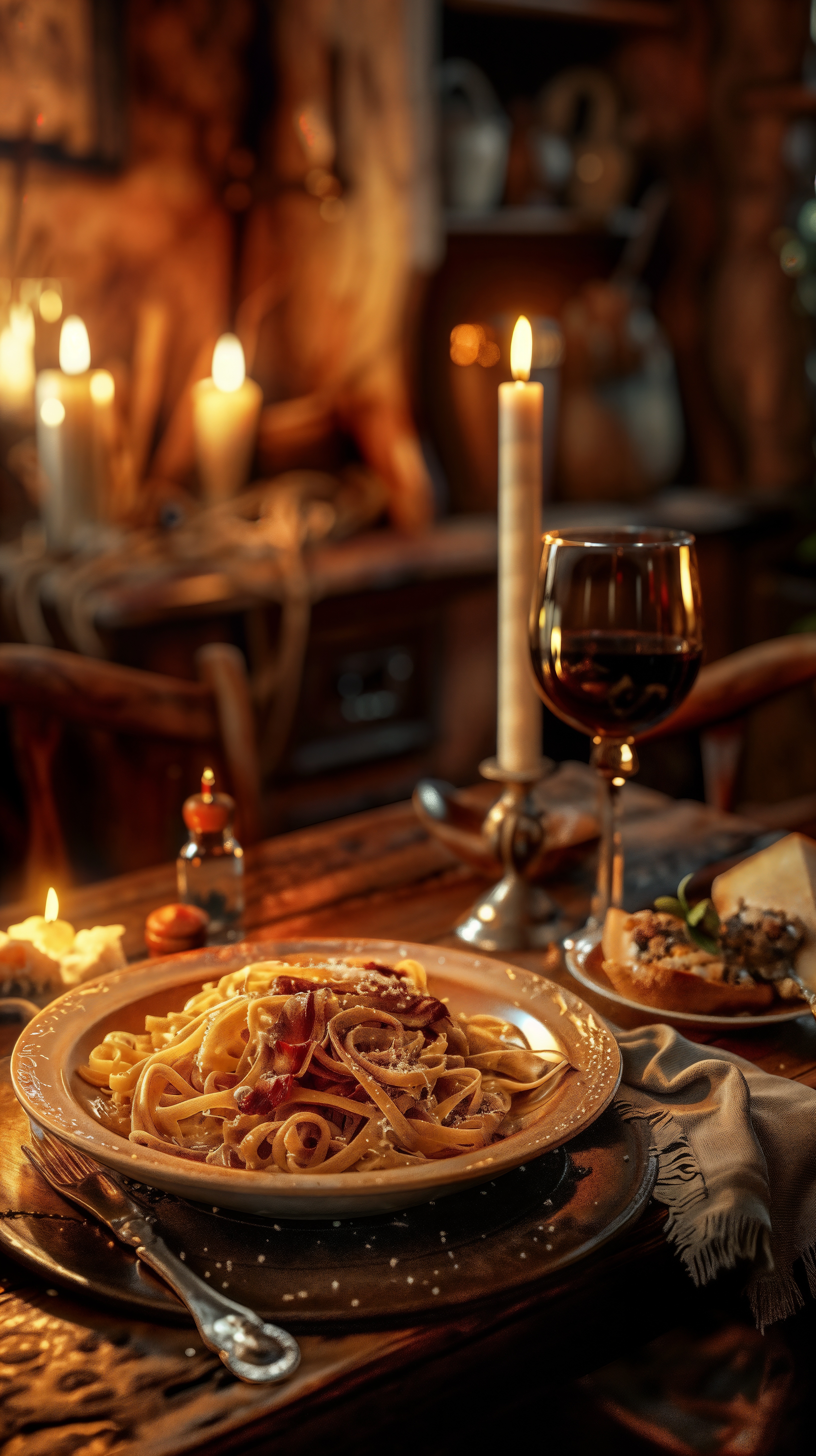 candle-litcozy atmospheredetailed sceneeleganceromancerustic tablesoft lightingspaghetti carbonarawarm toneswine glasses