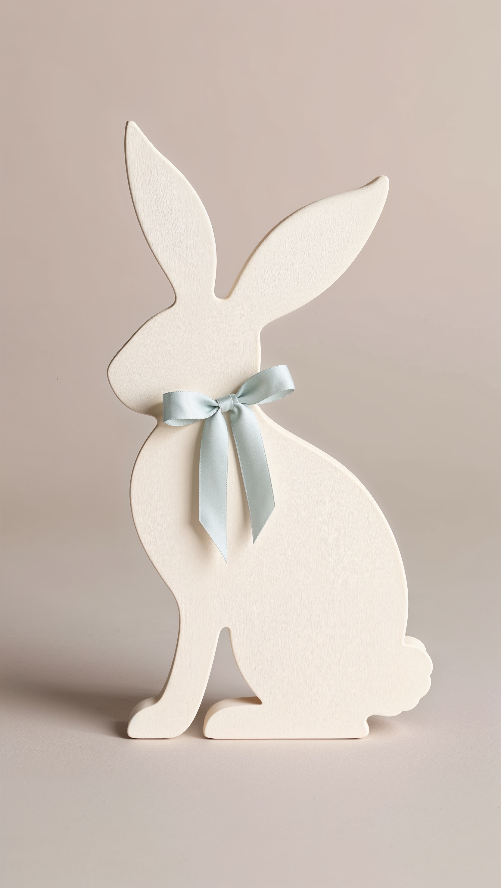 A white wooden Easter bunny with a blue ribbon is displayed in a simple and elegant style. It sits against a solid background, perfect for a clean aesthetic.