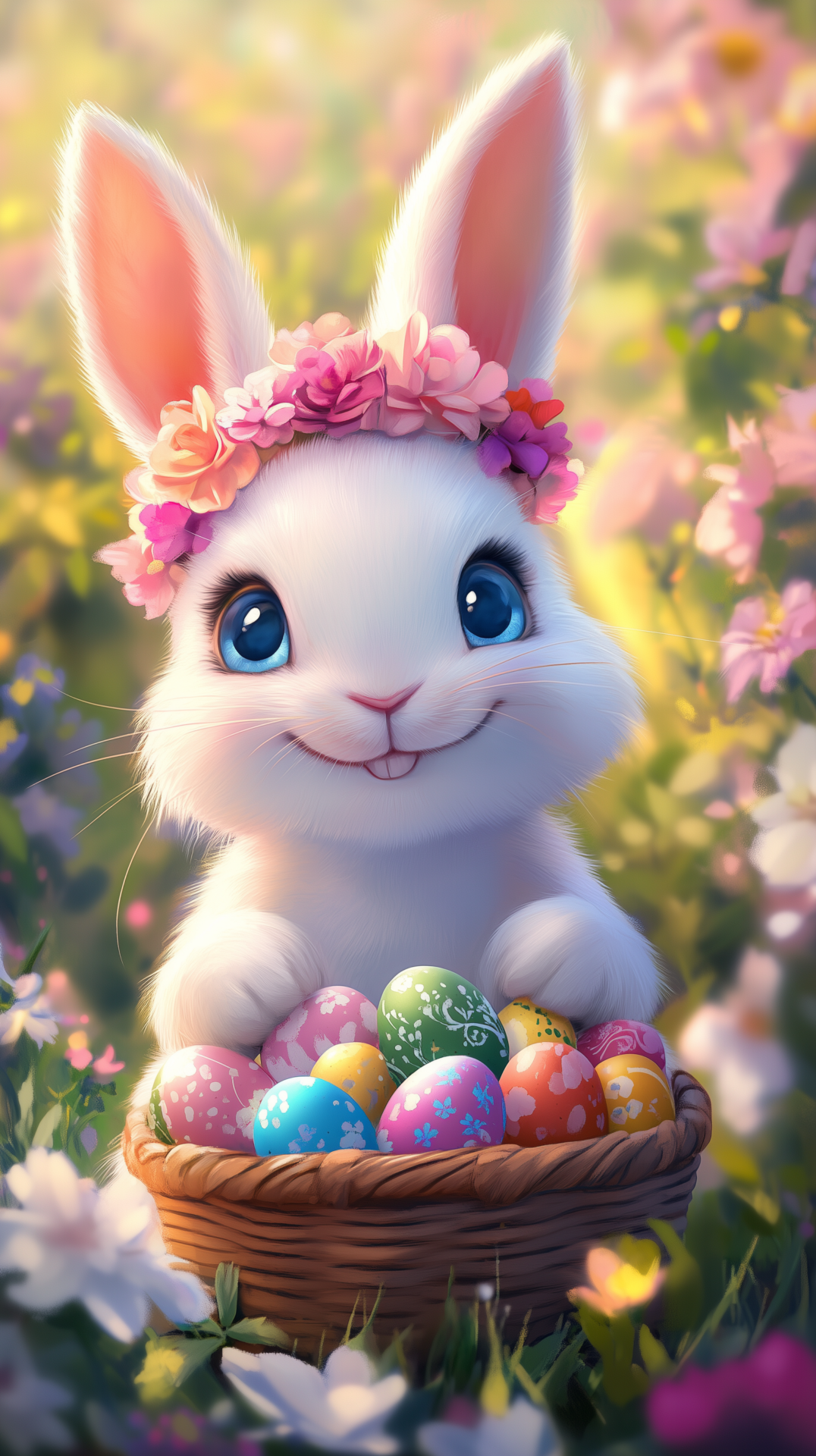 A smiling white bunny with bright blue eyes sits in a basket filled with colorful Easter eggs, wearing a flower wreath on its head. Rendered in soft pastel colors and digital cartoon style, the bunny’s joyful face and round features reflect the charm of Disney Pixar animation. Gentle lighting adds warmth to the scene, enhancing the soft textures and whimsical details. This Easter-themed artwork radiates sweetness, innocence, and festive springtime cheer.
