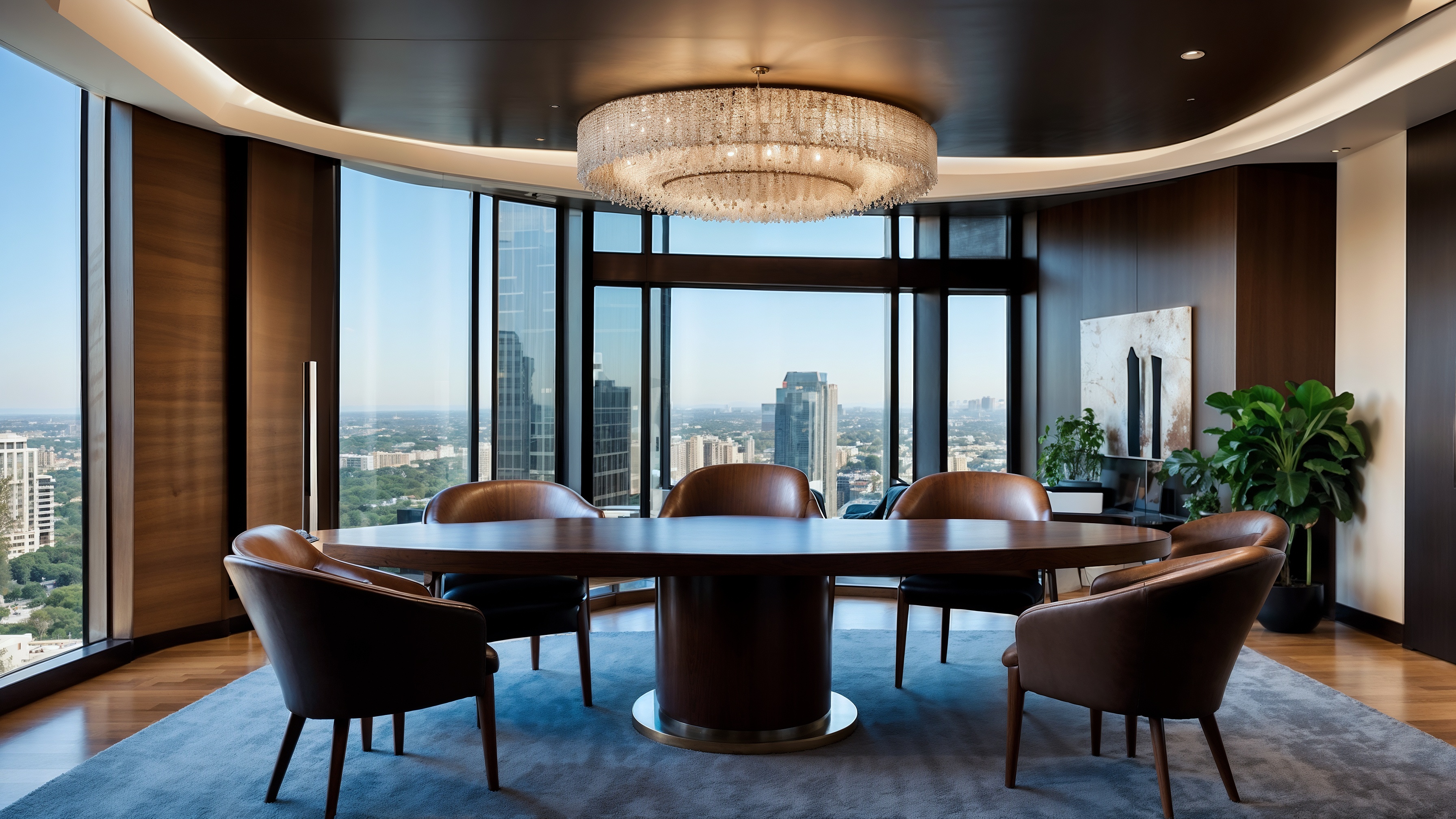 A modern boardroom with a round table, leather chairs, large windows, a stylish chandelier, dark wood accents, and blue carpet.