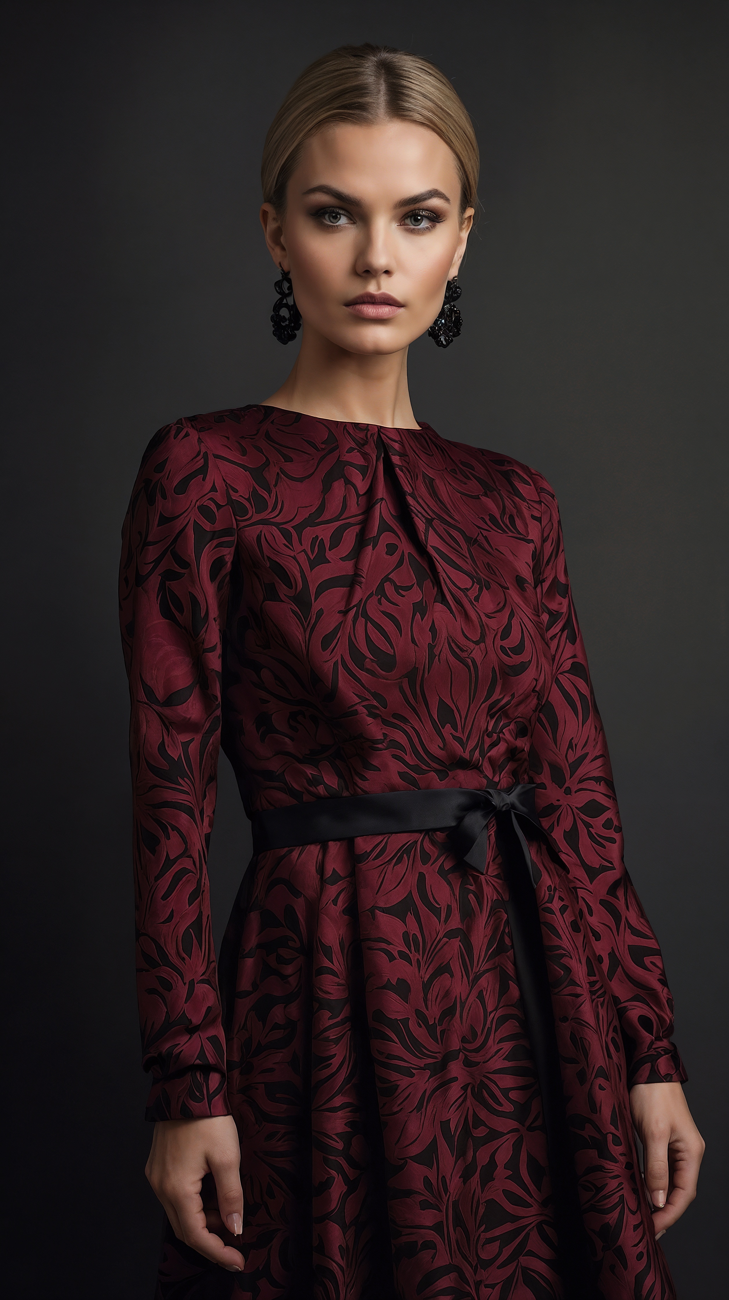 A confident model faces forward in a burgundy dress with long sleeves, a waist belt, and dark floral patterns. Her blonde hair falls to the side, styled elegantly to highlight her large, matching earrings. The deep black background contrasts with the rich red fabric, enhancing the dress’s elegance in a professional fashion photo.