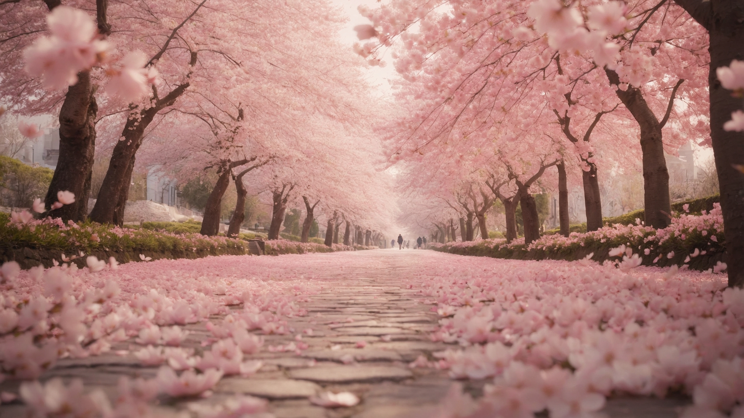 This free AI generated image captures a peaceful cherry blossom path during spring, with delicate pink petals covering the ground and blooming trees forming a soft floral canopy. The scene evokes tranquility, renewal, and natural beauty, making it ideal for spring and nature-inspired visuals.