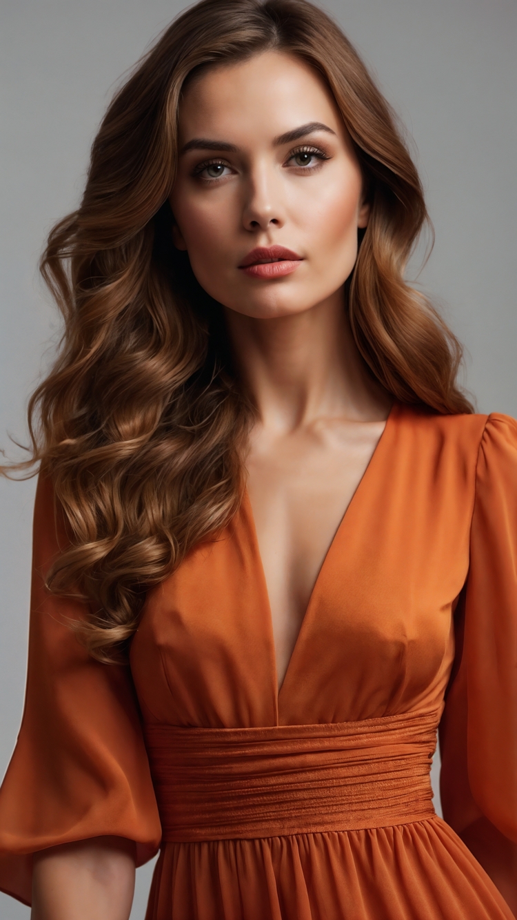 A close-up portrait of a young woman with soft, voluminous wavy brown hair cascading over her shoulders. She has a calm and confident expression, looking directly at the camera with subtle makeup emphasizing her natural beauty. She wears an elegant, deep V-neck burnt orange dress with gathered fabric details around the waist and flowing puff sleeves, standing against a simple smooth gray background.