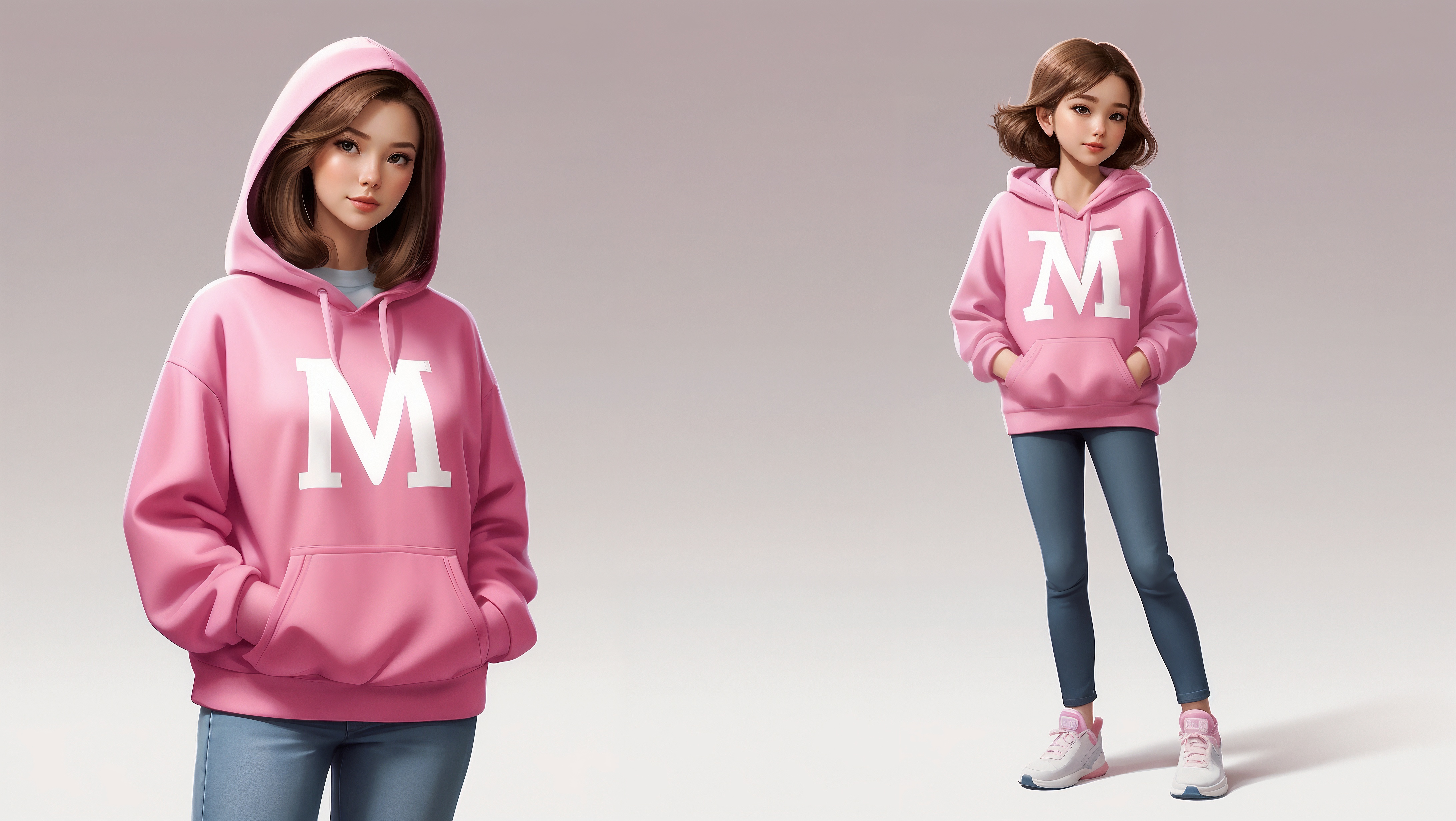 3D renderambient occlusionblue jeansbrown haircharacter designcute womanisometricpink hoodieultra-wide anglewhite M logo