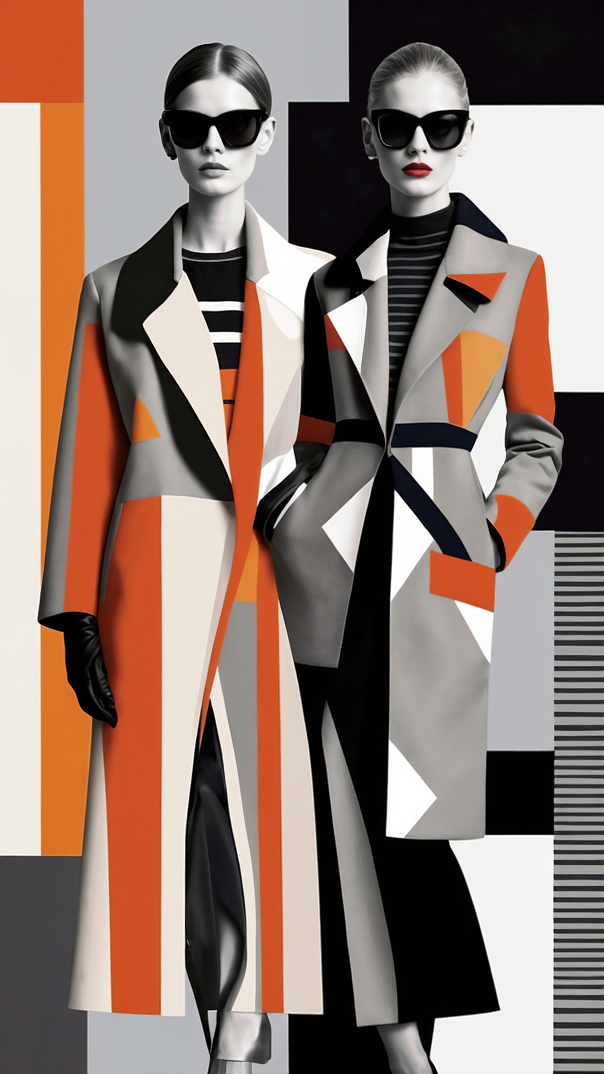 Two models pose in a modern fashion illustration. Their coats and suits feature geometric patterns. Shades of grey dominate their outfits. Orange accents add bold highlights to the design. Black lines form sharp contrasts in the background. The white base enhances the striking composition. Their attire embodies contemporary elegance and graphic style.