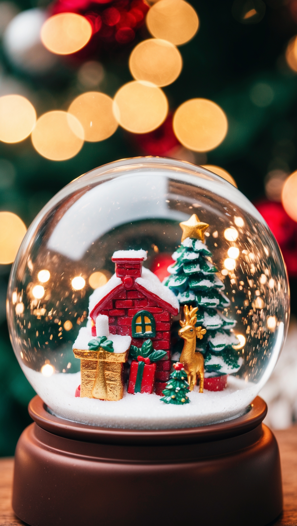 Free AI Image: A snow globe with Christmas decorations inside, including small houses and reindeer, set against the backdrop of blurred lights. It’s a cute aesthetic that adds charm to any space, in the style of a fashion photograph.