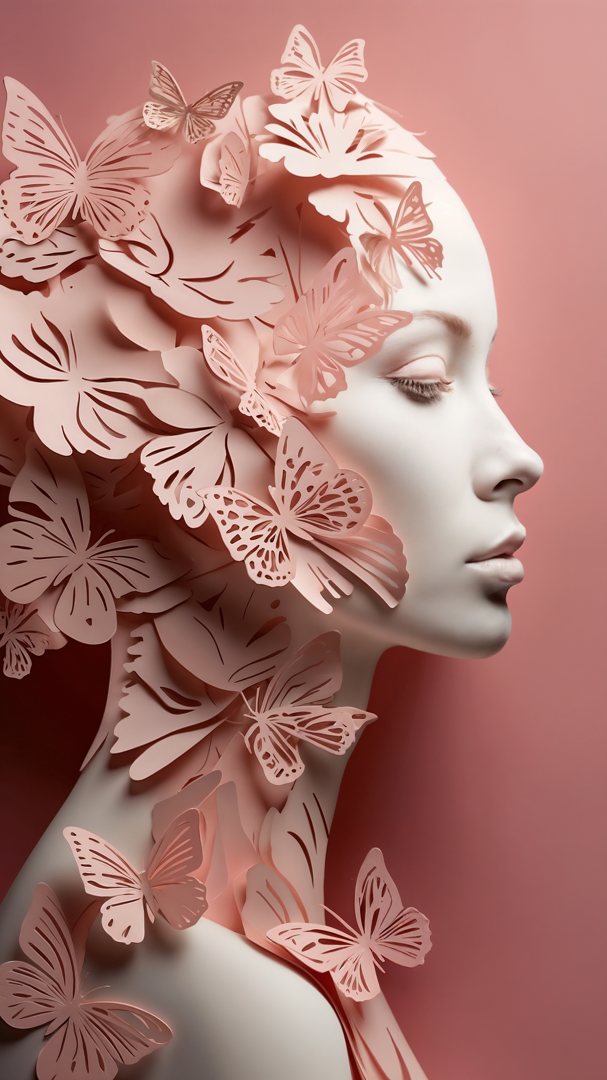 This free AI generated image features an elegant woman portrait in a paper sculpture style, surrounded by delicate butterflies that symbolize transformation, growth, and inner strength. The soft color palette and refined artistic composition make this visual especially suitable for International Women’s Day projects.