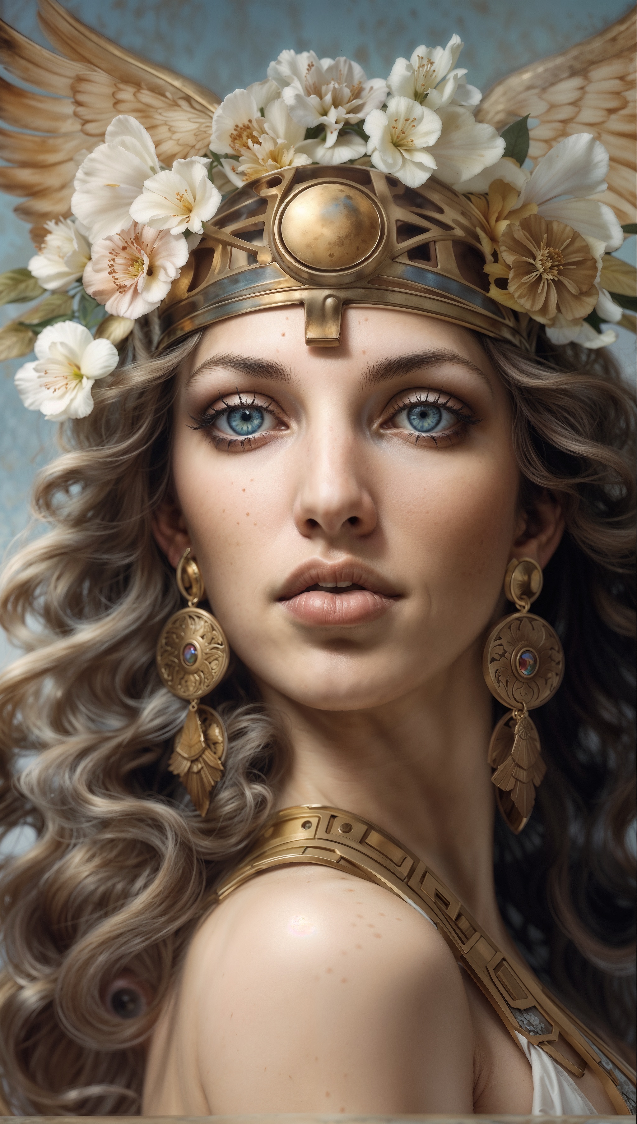 Free AI Image: Goddess of Beauty, gold headband with white flowers in the hair, symmetrical composition, golden earrings and accessories, oil painting, fantasy portrait, long curly light brown wavy half updo hair, blue eyes, soft smile, beautiful facial details, wearing ancient Greek armor, winged background, oil paint texture, ultra-realistic.