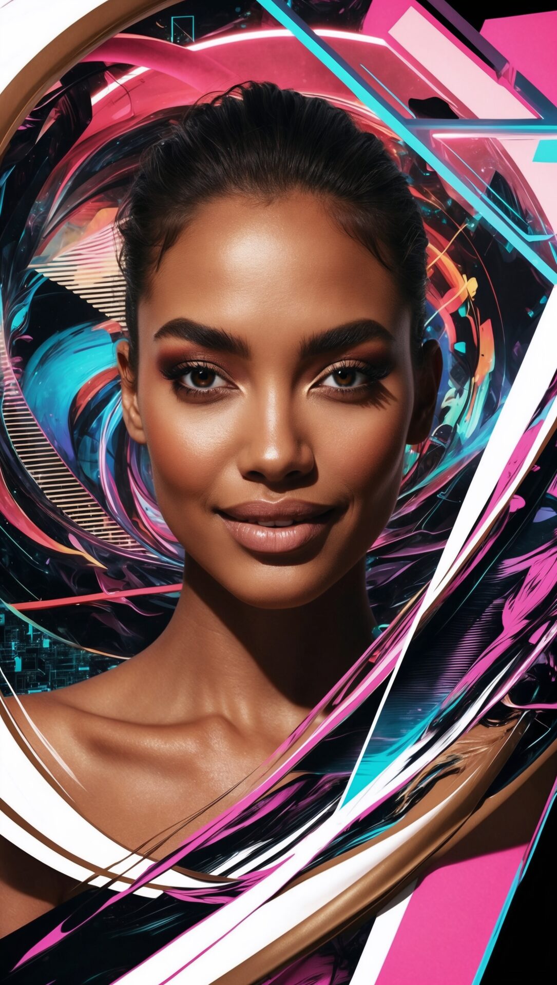 A beauty ad featuring a brown-skinned woman with flawless skin and modern makeup, framed by geometric shapes and a futuristic cityscape.
