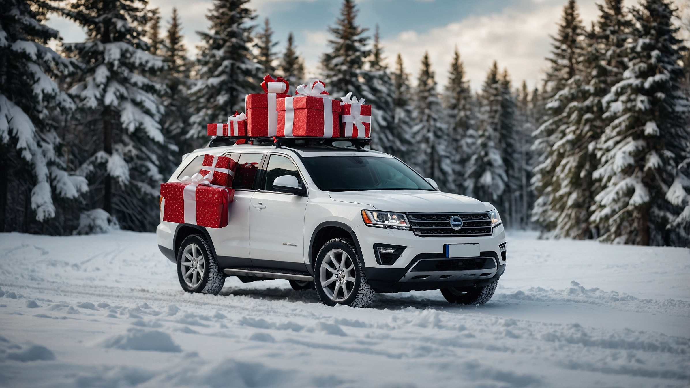 Free AI Image: White SUV with presents on the roof, winter forest background, snow-covered road, Christmas concept, commercial photo